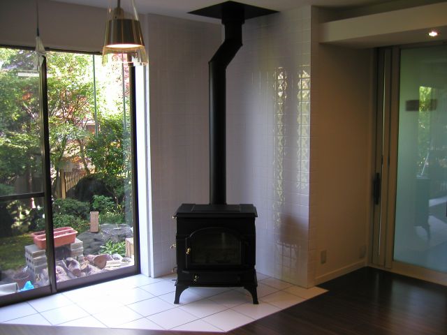 キャットウォークの梁を二重煙突でかわしています。2m以上ある煉瓦タイルが格好いいですね!ストーブの詳細は下記をクリックhttp://www.dutchwest.co.jp/stove/products/stove/seneca.html